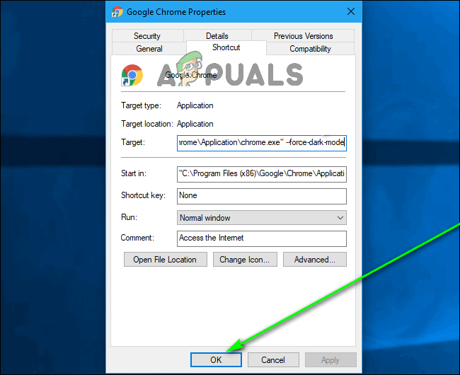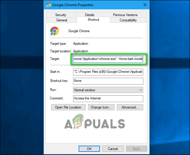 Add “–force-dark-mode” to the Target field - Click on Apply.