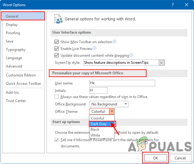 Changing the theme in General settings - Then click on the Ok button to apply changes of the theme in Microsoft Office.