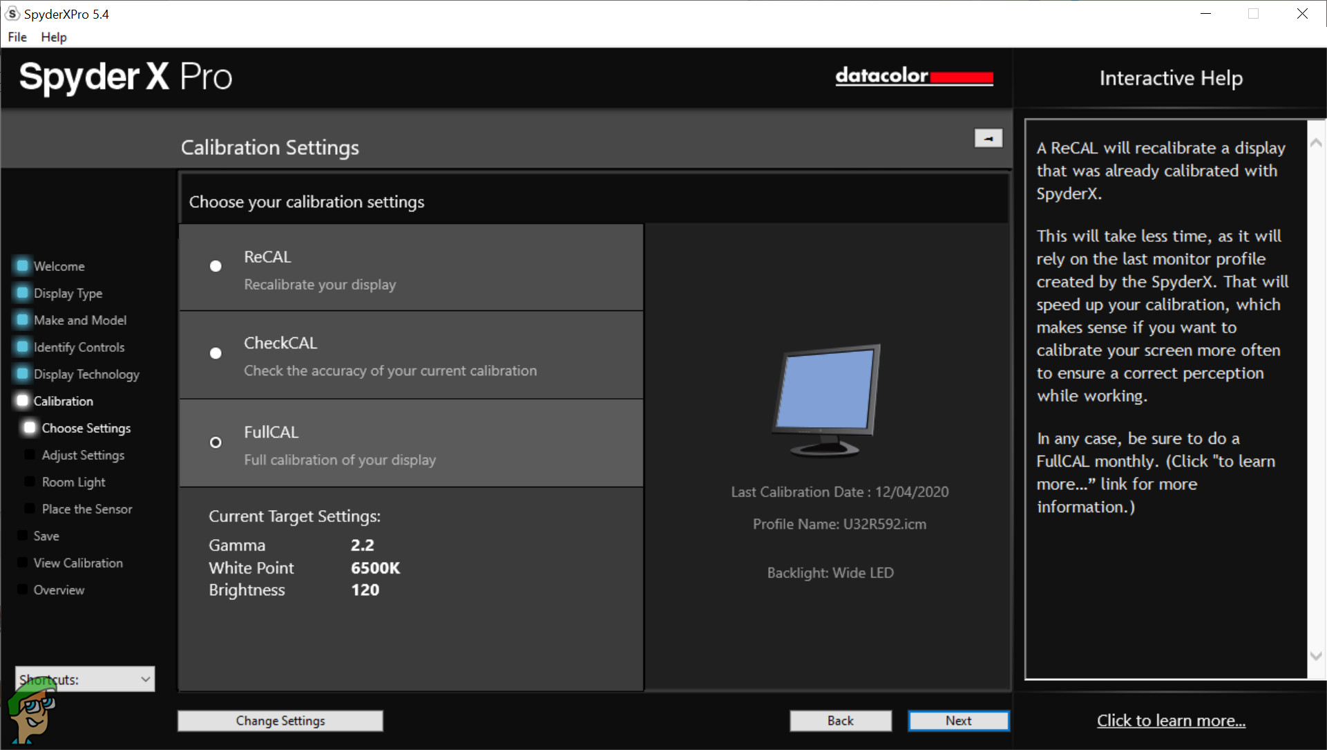 If you have previously done a calibration by a SpyderX colourimeter, you can do a ReCal which matches the settings to the profile that has already been established. Whereas, the full calibration is sort of like a fresh one. Regardless, you should do a full calibration at least once a month to make sure that the profile is up to date and adjusted to whatever changes may have occurred.