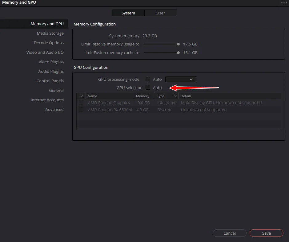 - Resolve > Preferences > System > Memory and GPU.