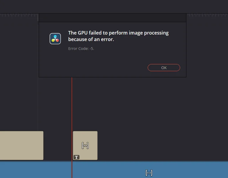 DaVinci Resolve may stop with “The GPU failed to perform image processing because of an error.” (Error Code 5). This can break playback, stop effects from rendering, or fail exports mid-way.