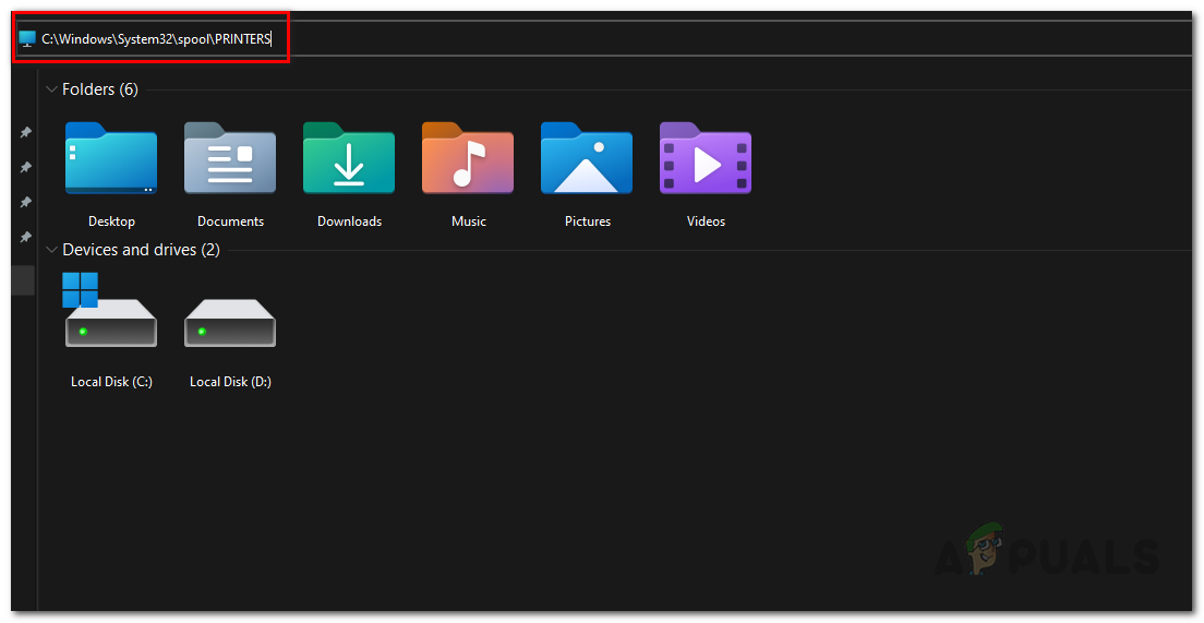 Navigating to Printers Folder - There, delete all the files and folders. Make sure that you have hidden files enabled so that you can clear them out as well.