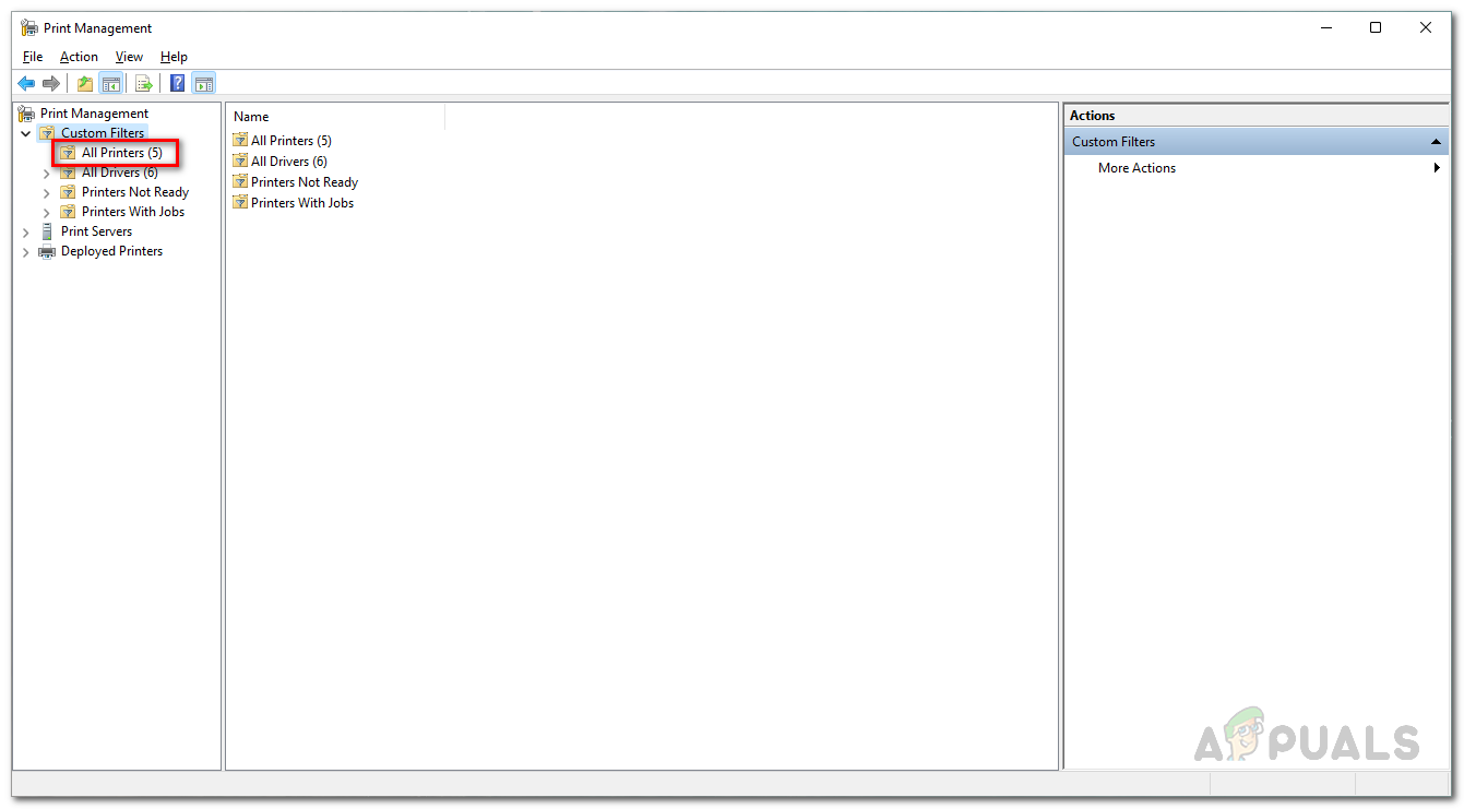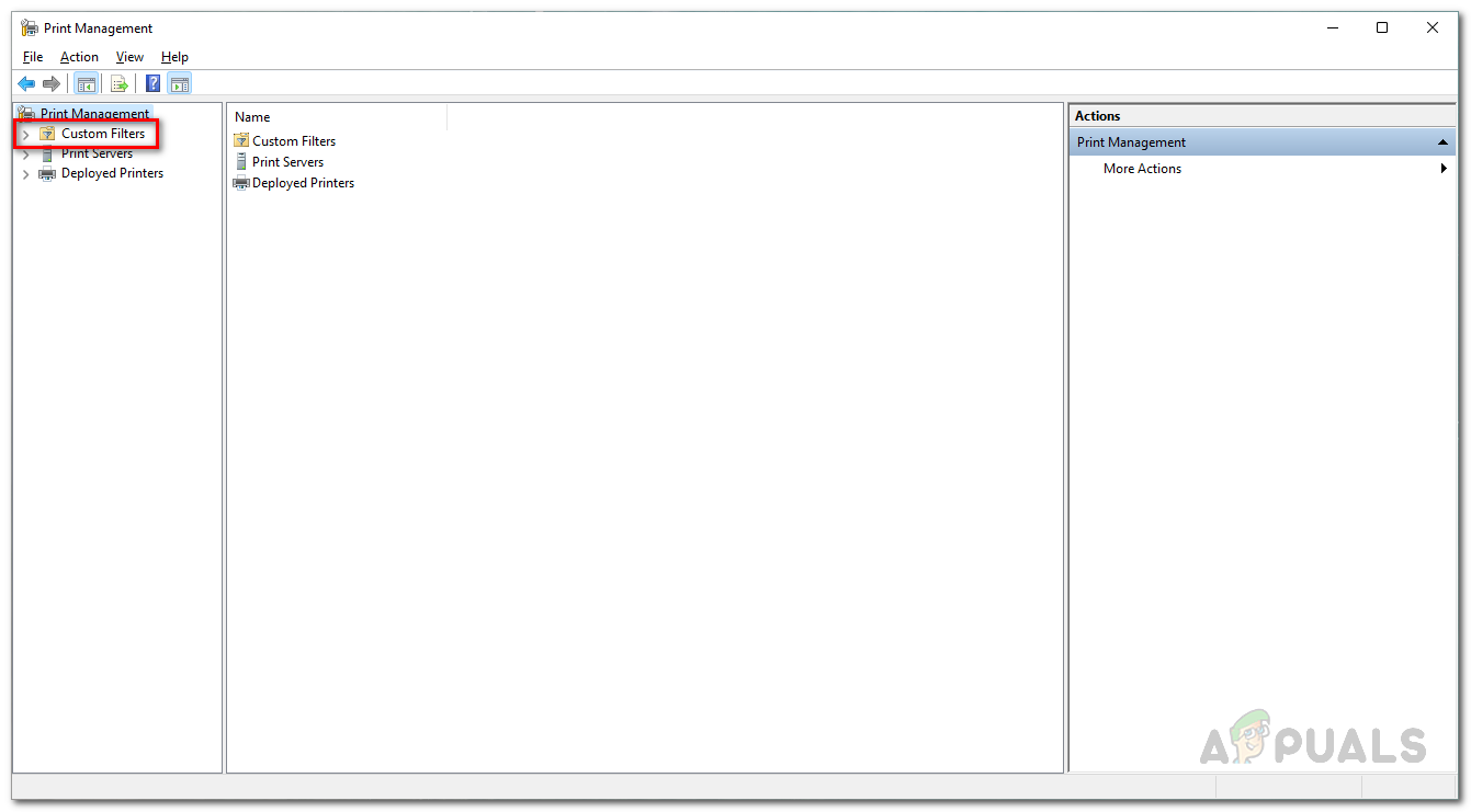 Opening up Print Management - On the left-hand side, expand the Custom Filters list.