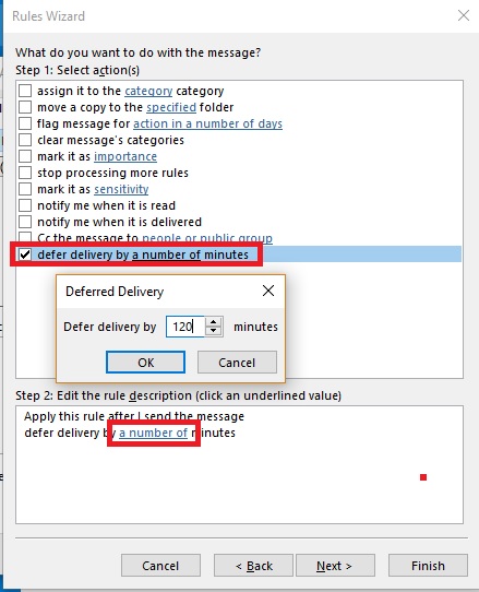 - Now from the next action list, check the box next to defer delivery by a number of minutes. Next, click on the “a number of” link at Step and enter the number of minutes to delay the delivery of all your email messages. You can insert the values manually or use the up and down arrows to adjust the value. Hit OK when you’re done.