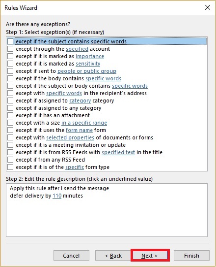 - You’ll be presented with another batch of exception rules. Again, if you want the rule to apply to all emails, hit Next without checking any box.
