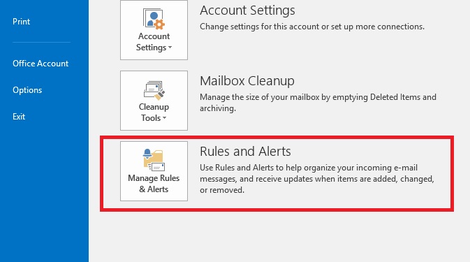 Note: In Outlook 2007, open the Tools menu then click on Rules and Alerts. - Then, find and click on Manage Rules & Alerts.