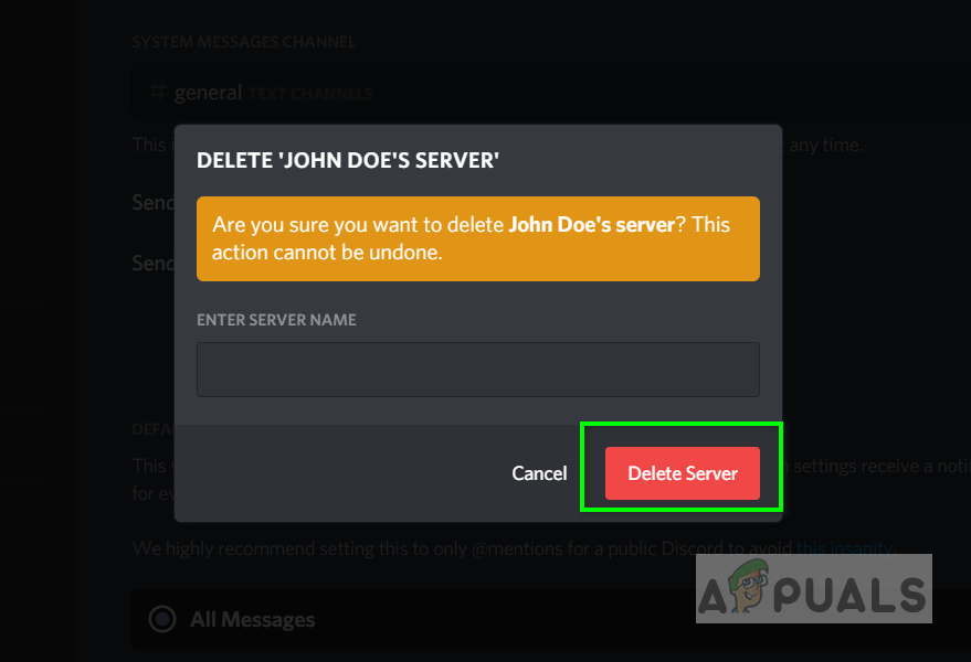 Deleting the Discord Server - Some users have two-factor authentication enabled on the server, they will need to enter the verification code before they can delete the server.
