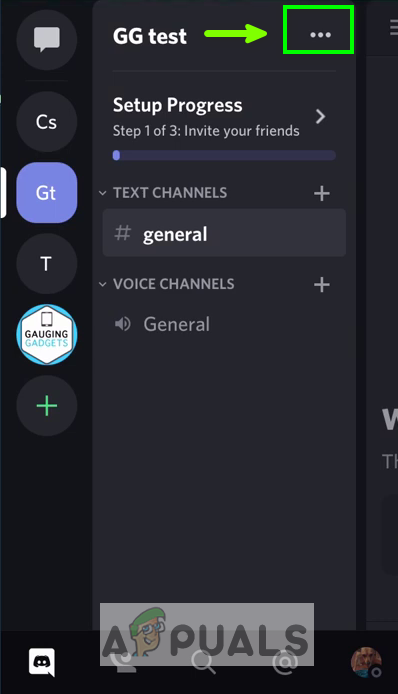 Find the server in the left server sidebar and open that server - You will see the server name at the top of the screen; open the Server Menu by clicking on three horizontal dots just to the right of the server’s name.