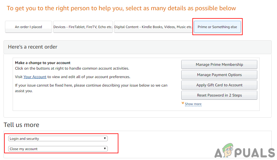 Contact Us button for Amazon website - Here you need to select Prime or Something else tab. In the tell us more select Login and security and Close my account options as shown below: