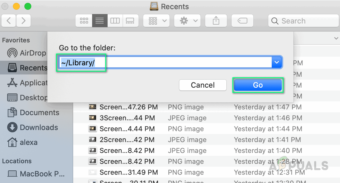 - In the top menu bar, click Function > Go To, type ~/Library, and click Go.
