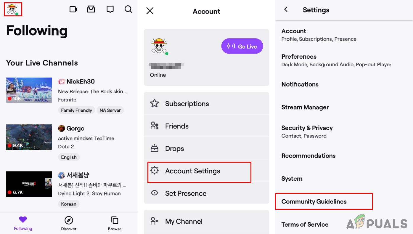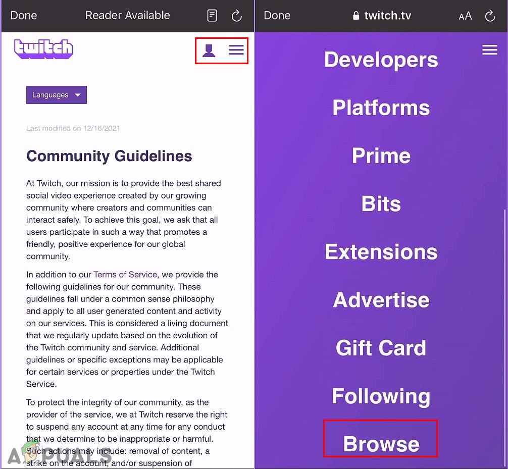 Opening Community Guidelines page on Twitch App - Now tap on the person icon next to the menu icon at the top right corner. Finally, tap on the Browse button to start Twitch in a PC version.