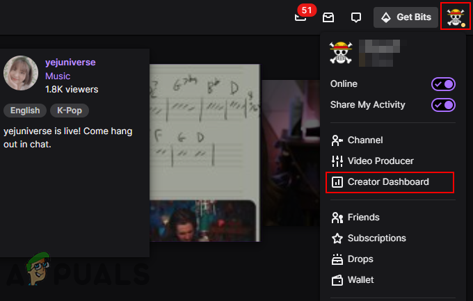 Note: If you can’t find the profile icon, then make sure you are on twitch and not on the m.twitch site. - Tap on the Profile Icon at the top right corner and choose the Creator Dashboard option.