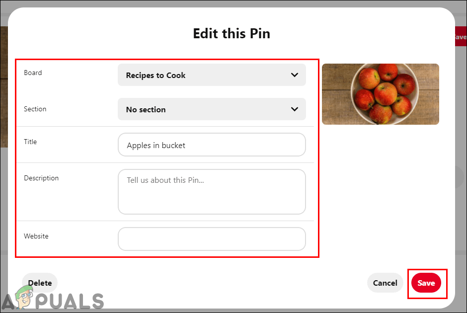 Editing a pin - Here you can edit the Board, Section, Title, and Description of the pin to whatever you want. After making changes, click on the Save button to apply changes.