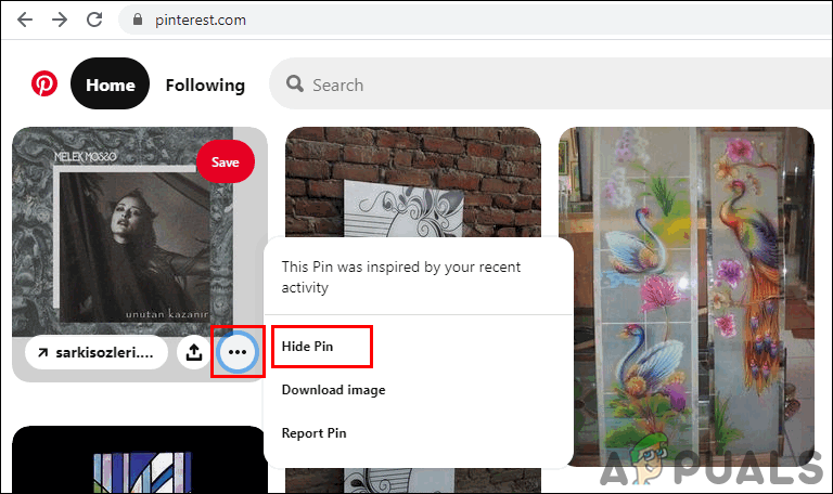 - On the Home page move mouse cursor over any pin. You will see 3 dots or menu icon on a pin, click on it and choose Hide Pin option.