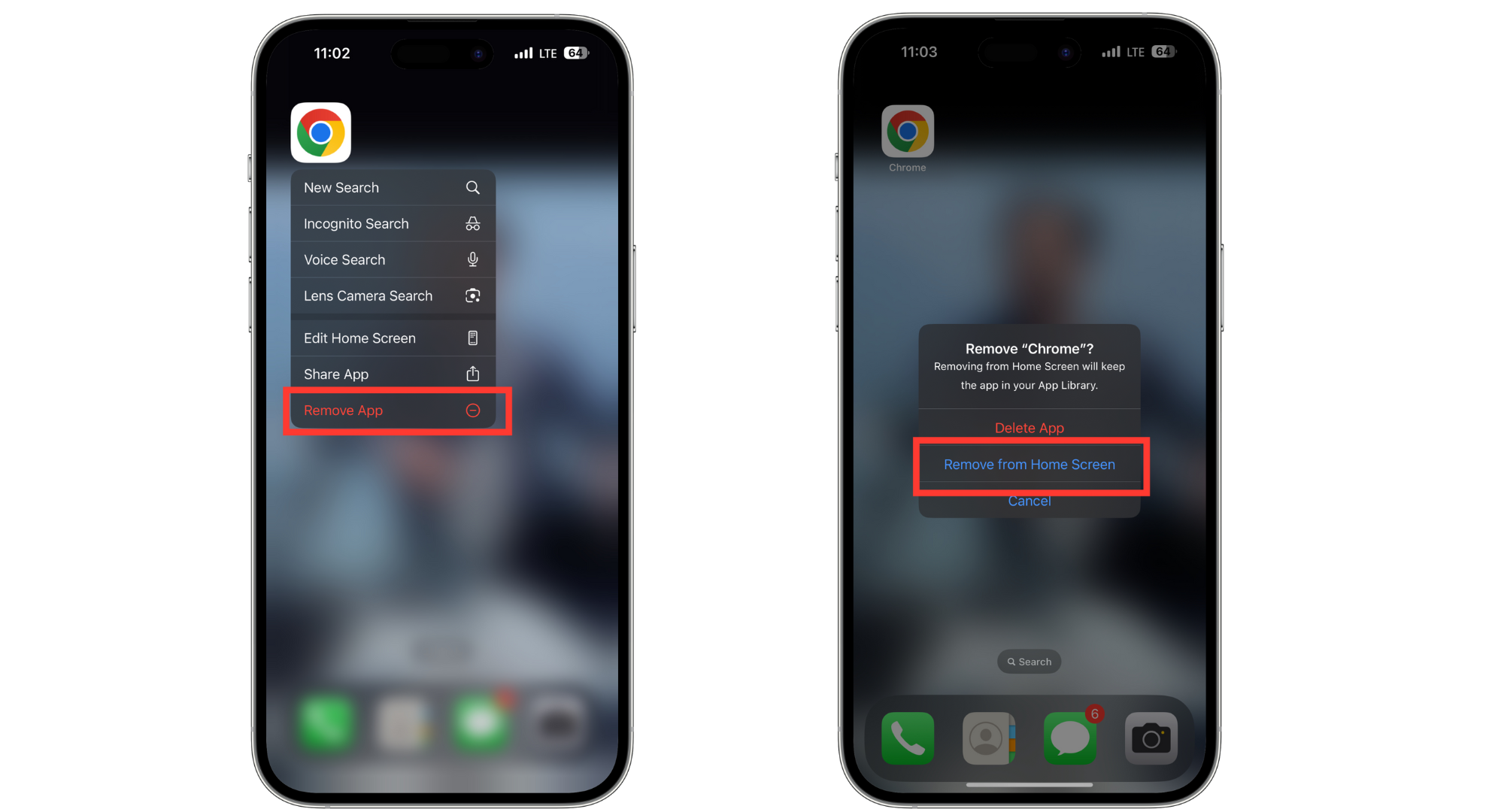 - Choose “Remove from Home Screen.” This makes the app icon disappear from your home screen.