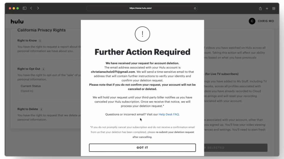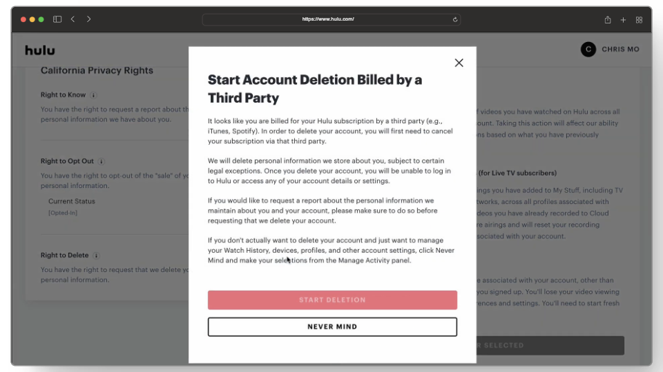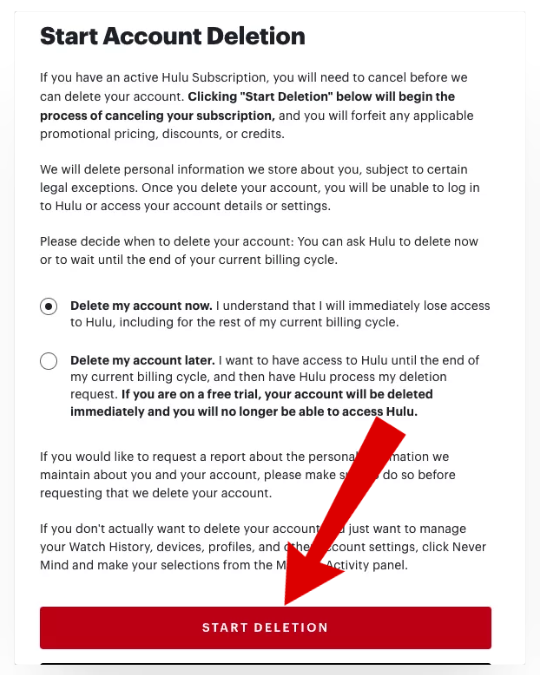 Click on start deletion - Make sure to check your email for further instructions and confirmation messages regarding your deletion request. It can take a couple of days for Hulu to get your request completed.