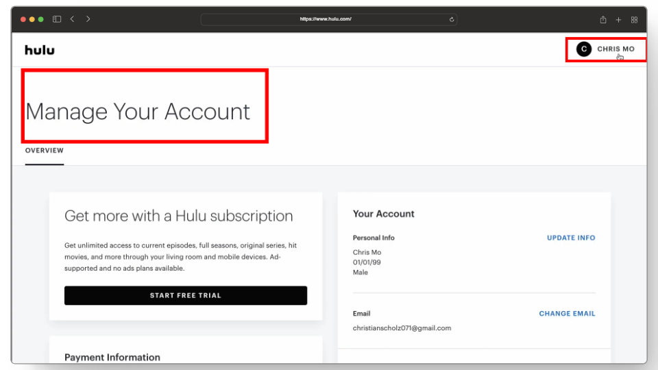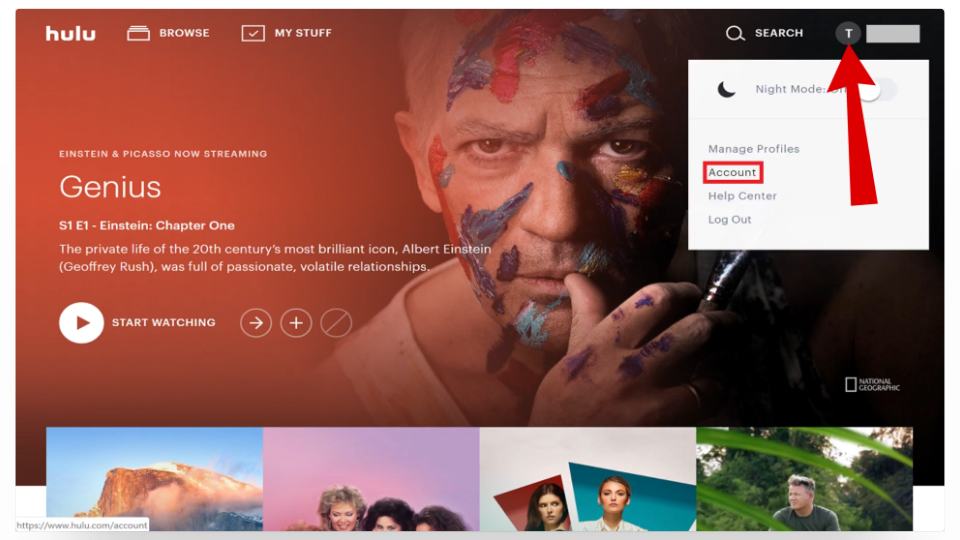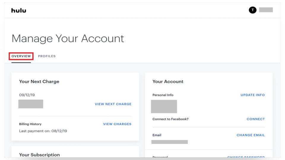 Log in to your Hulu account - From here, click on your profile icon and you’ll be redirected to the “Manage Your Account” tab.