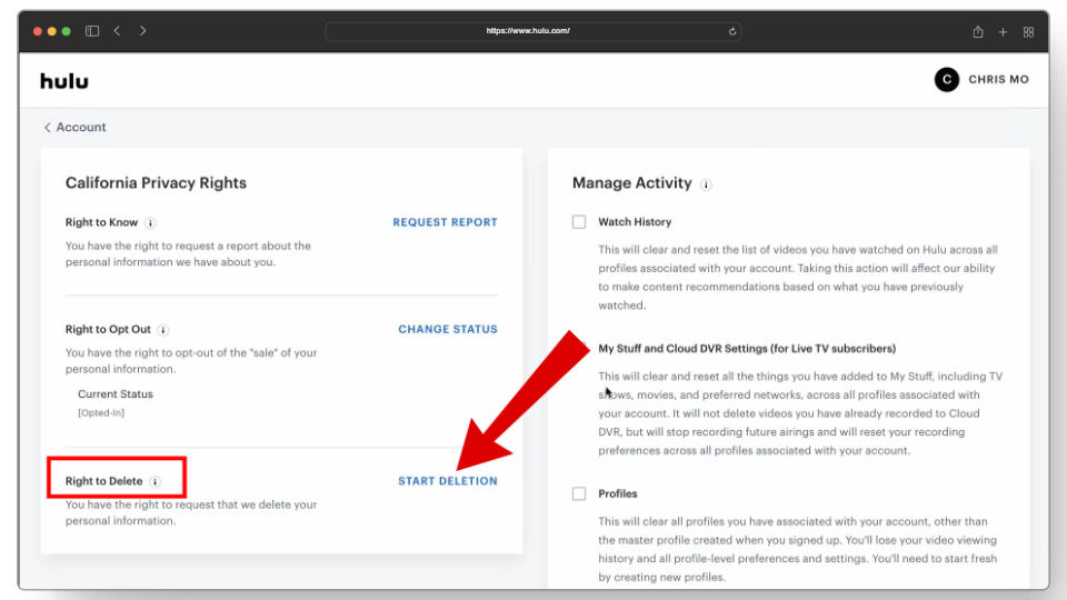 Click on the California privacy rights button - Once that loads up, look for the “Right to Delete” tab. Here, click on the “Start Deletion” option.