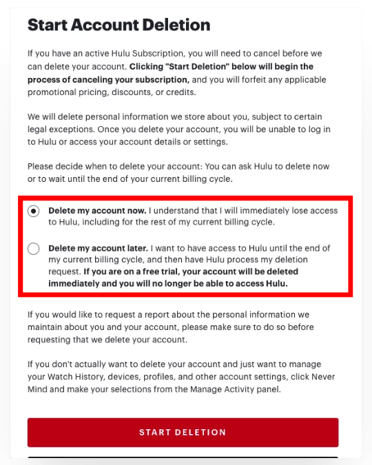 Choose from the two options If you haven’t already canceled your subscription, then we recommend selecting the Delete my account later option but if you have canceled your subscription then select the Delete my account now option. - Once that’s done, click on the “Start Deletion” button and your account deletion request will be forwarded to Hulu.