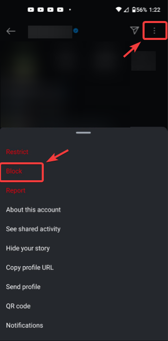 - Then, tap on the three dots in the top right corner and select Block.