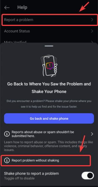 - Then, tap Report a Problem and select Report Problem without shaking.