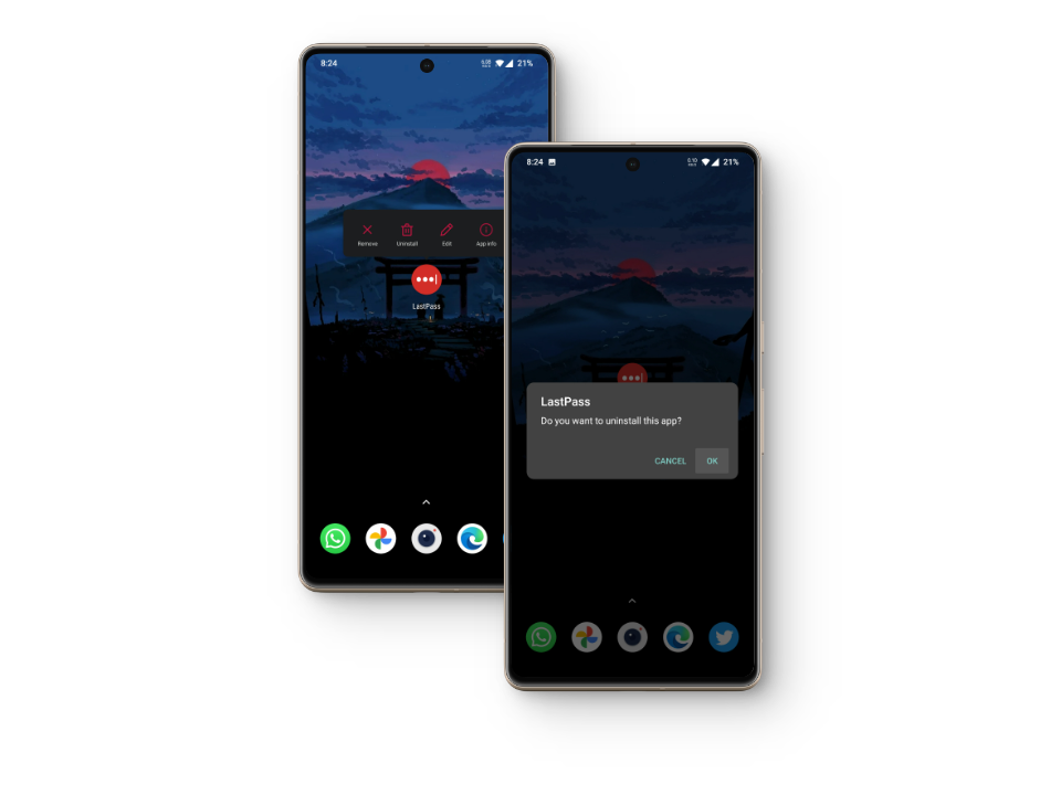For example, on a OnePlus device, pressing and holding the LastPass app icon, either from your list of apps or directly on the home screen, will prompt a menu to appear where you can select Uninstall: