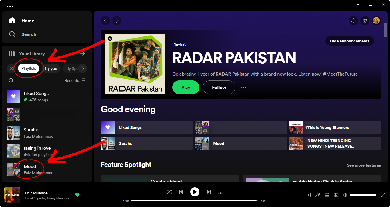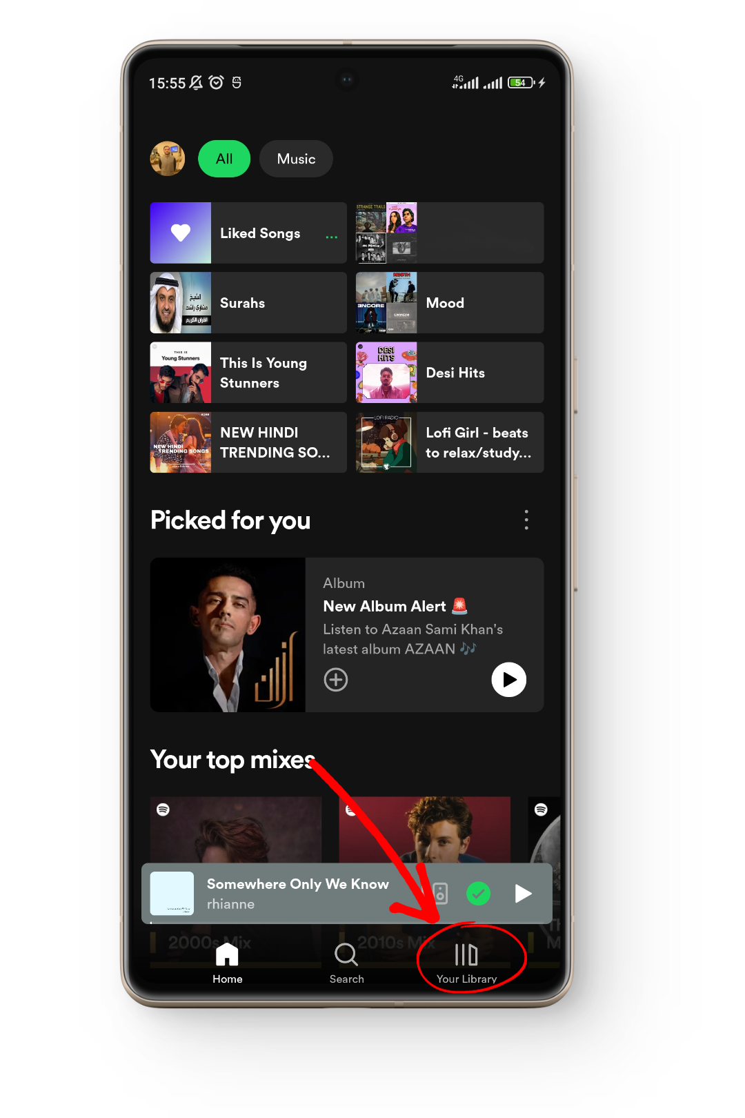 Upon opening Spotify, your most frequently played playlists will appear in the Home section. To view all of your playlists, liked songs, and downloaded content, tap on “Your Library” at the bottom right of the screen.