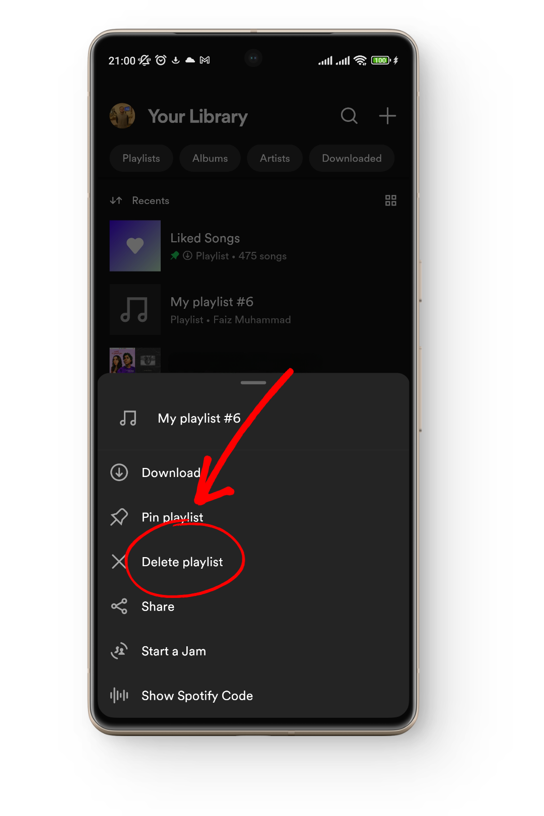 From the available options, you can select an action such as downloading the playlist for offline listening, pinning it to the top, sharing it, or deleting it. Choose Delete Playlist.