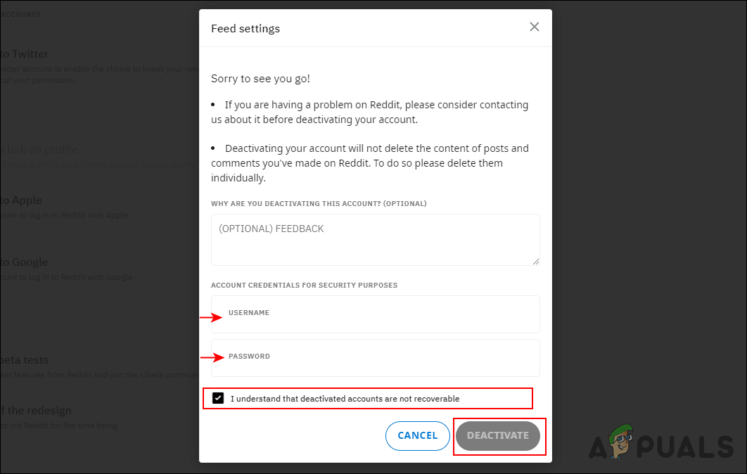 Clicking on Deactivate Account - A dialog box will appear. Enter your username, password, and check the “I understand…” option. Then click on the Deactivate button.