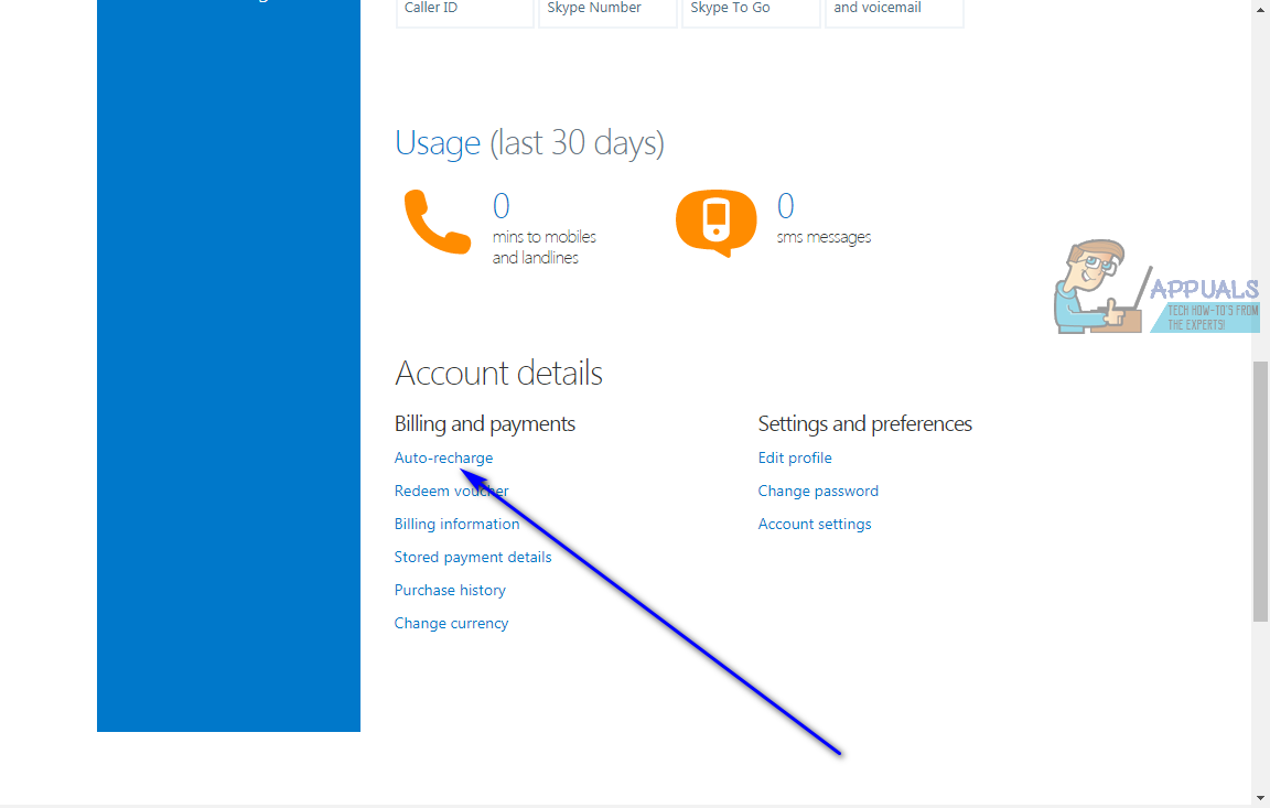 - If you have recurring payments enabled on your Skype account to, say, have your Skype credit automatically topped up when it falls below a specified threshold, it is highly recommended that you disable the Auto-Recharge feature before you delete your Skype account for good. Scroll down to the Account details section and click on Auto-recharge under Billing and payments.