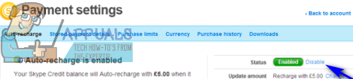 - Click on Disable next to Status, and recurring payments for the Skype account will be successfully disabled.