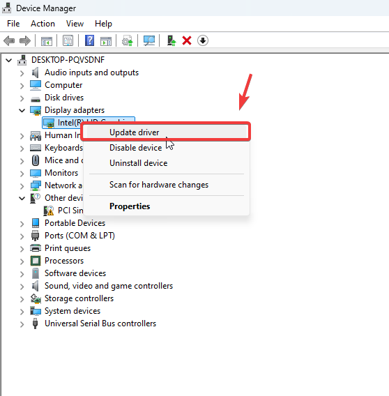 - In Device Manager, locate and expand Display Adapters. Right-click your GPU driver and choose Update driver.