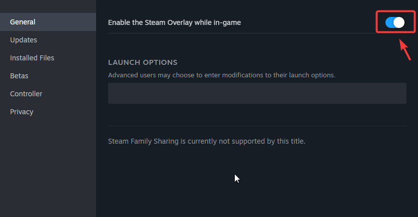 - In the properties menu, toggle off the option Enable the Steam overlay while in-game.