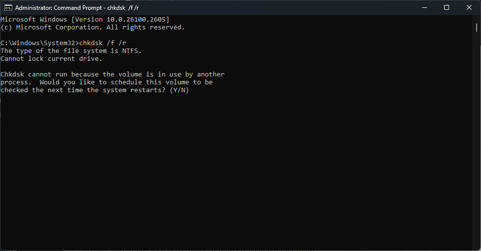 Replace C: with the letter of the target drive if it’s different. - If prompted, type (Y) to schedule the check for the next restart and reboot your computer.