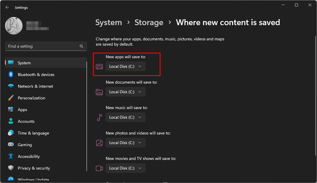 - In the “New apps will save to:” section, select your system drive (usually C:).