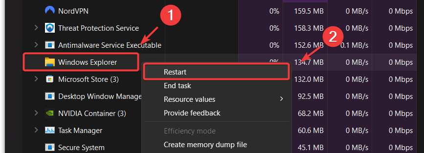 - In the Processes tab, right-click Windows Explorer and choose Restart.