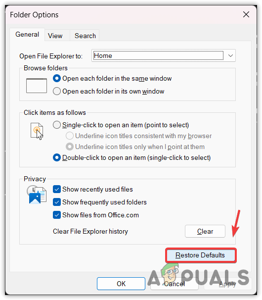 The issue is frequently caused by File Explorer’s history. Clearing this history and restoring File Explorer to its default settings may fix the problem.