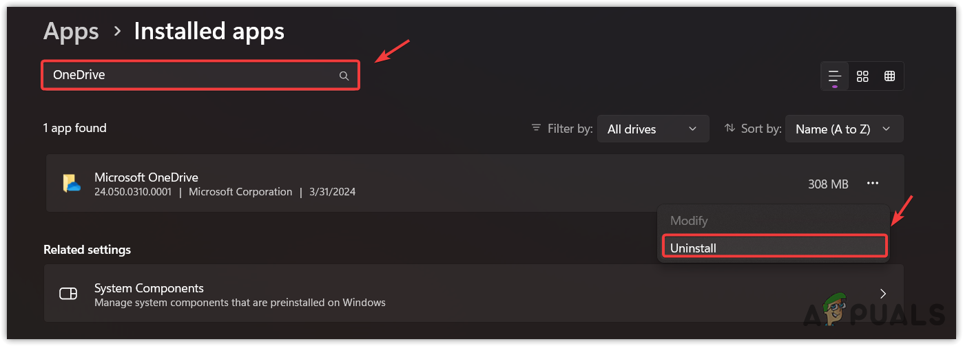- Find OneDrive, click the three-dot menu, and select Uninstall.
