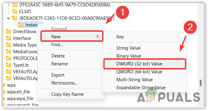 - Right-click on Instance, select New, and choose DWORD (32-bit) Value or QWORD (64-bit) Value depending on your system. For 64-bit operating systems, it’s advisable to try both, but delete the one that doesn’t work.