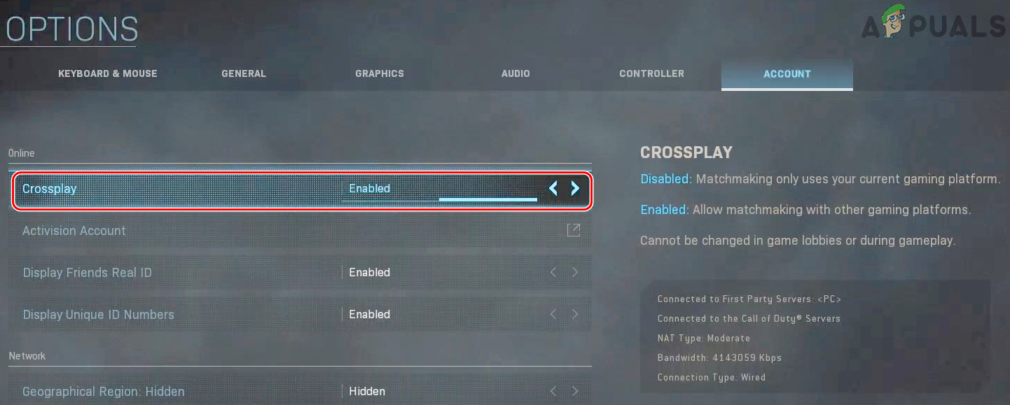 If the matchmaking feature of Warzone is glitched out, then it may lead to the dev error at hand, especially, in multiplayer mode. Here, disabling the Crossplay feature may clear the Warzone dev error.