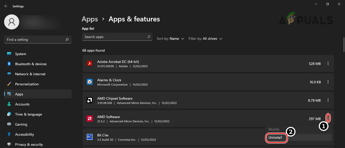 - Now, in front of the graphics utility (like AMD Software), click on three vertical ellipses and click on Uninstall.