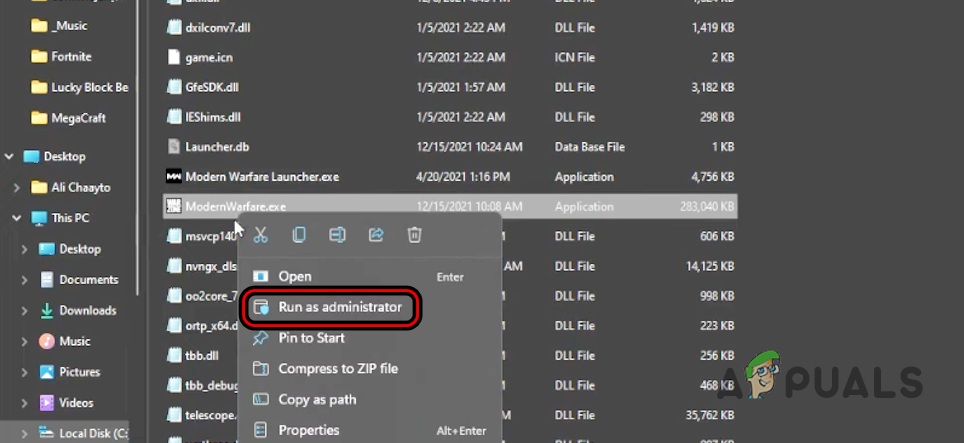 Launch Warzone as Administrator from the Installation Directory - Now wait for a few seconds and afterward, right-click on the ModernWarfare.exe file.