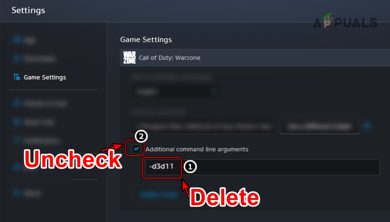 Remove Additional Command Line Arguments of Warzone - Then delete the argument (like -d3d11) in the Command Line Argument and untick the option of Command-Line Argument.