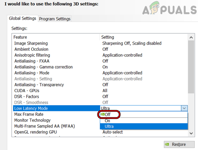 - Now select Low Latency Mode and under the Global Settings tab, disable it by selecting off in the dropdown.