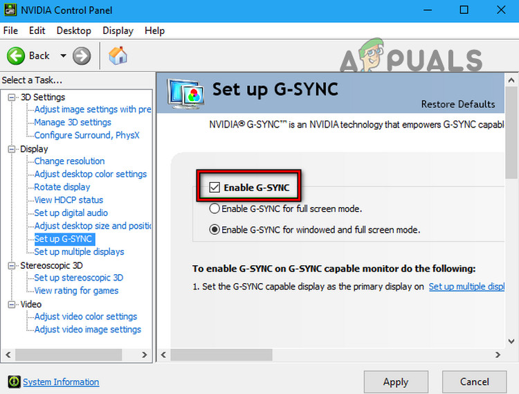 - Then steer to the Set–up G-Sync tab and on the right-hand side of the window, untick the checkbox of Enable G-Sync.