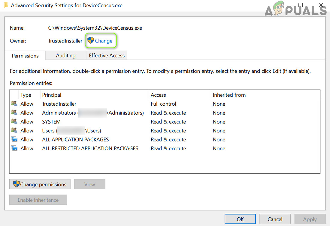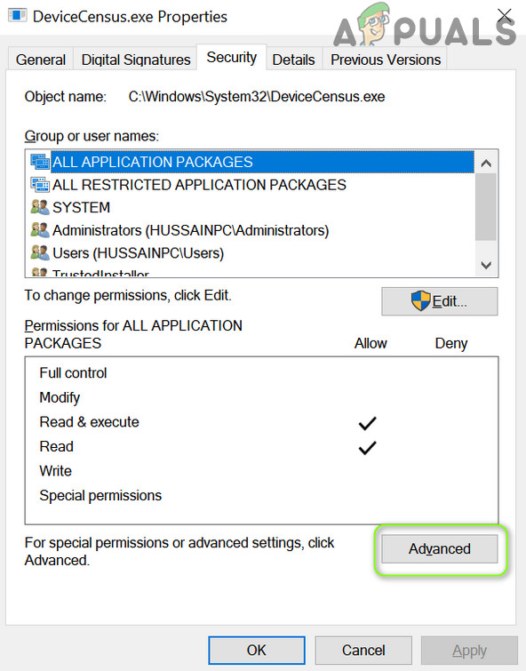 Open Properties of the DeviceCensus.exe File - Now steer to the Security tab and click on the Advanced button (near the bottom of the window).