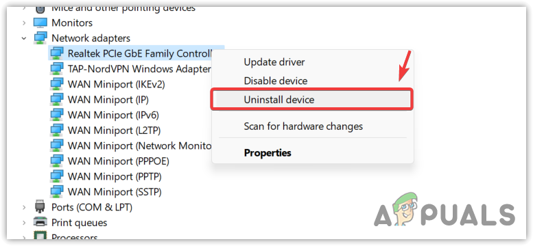 - Expand the Network Adapters, right-click on your network driver, and select Uninstall device.