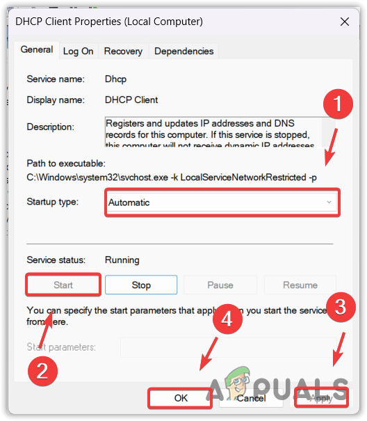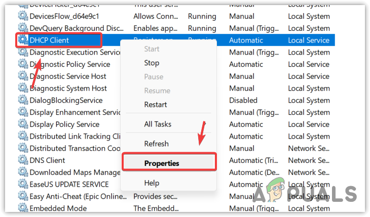 - Find the DHCP Client service and right-click on it to select Properties.