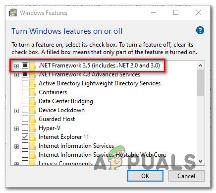 - Once you’re inside the Windows Features menu, start by checking the box associated with .NET Framework 3.5 (includes .NET 2.0 and 3.0) and click Yes at the confirmation prompt.