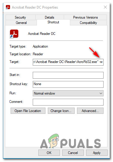 Accessing the Properties screen - Once you’re inside the Properties screen, click on the Shortcut tab, then add ‘-w‘ at the end of the Target text box and hit Apply in order to force the game to run in windowed mode.